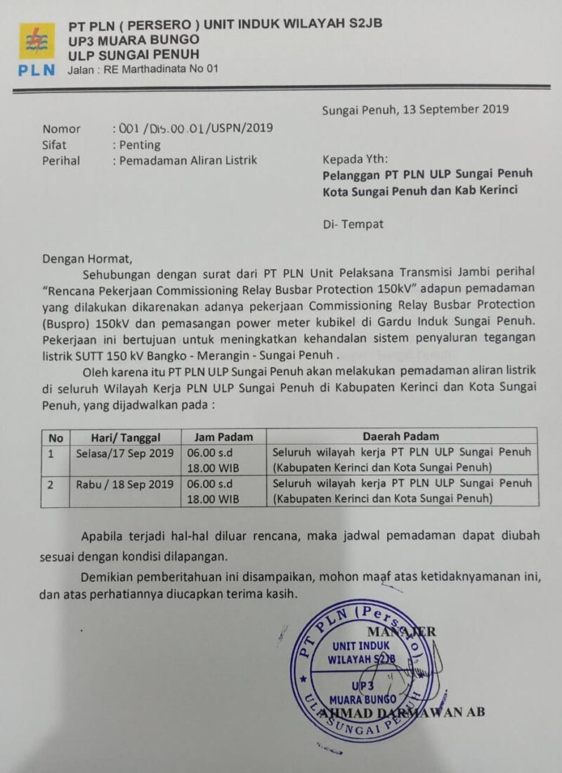 Tek Fhoto : Fhoto surat pemadaman listrik di Kabupaten Kerinci dan Sungai Penuh