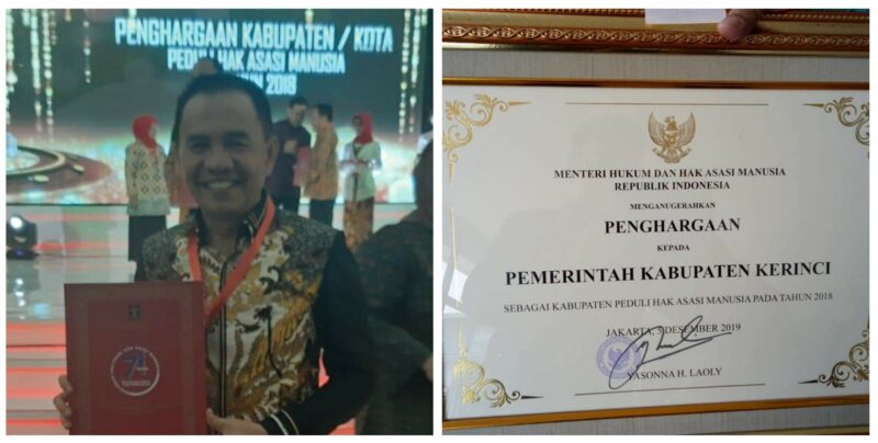 GLOBALJAMBI.COM, KERINCI – Pemerintah Kabupaten Kerinci dianugerahi penghargaan sebagai Kabupaten Peduli Hak Asasi Manusia oleh Kemenkumham.