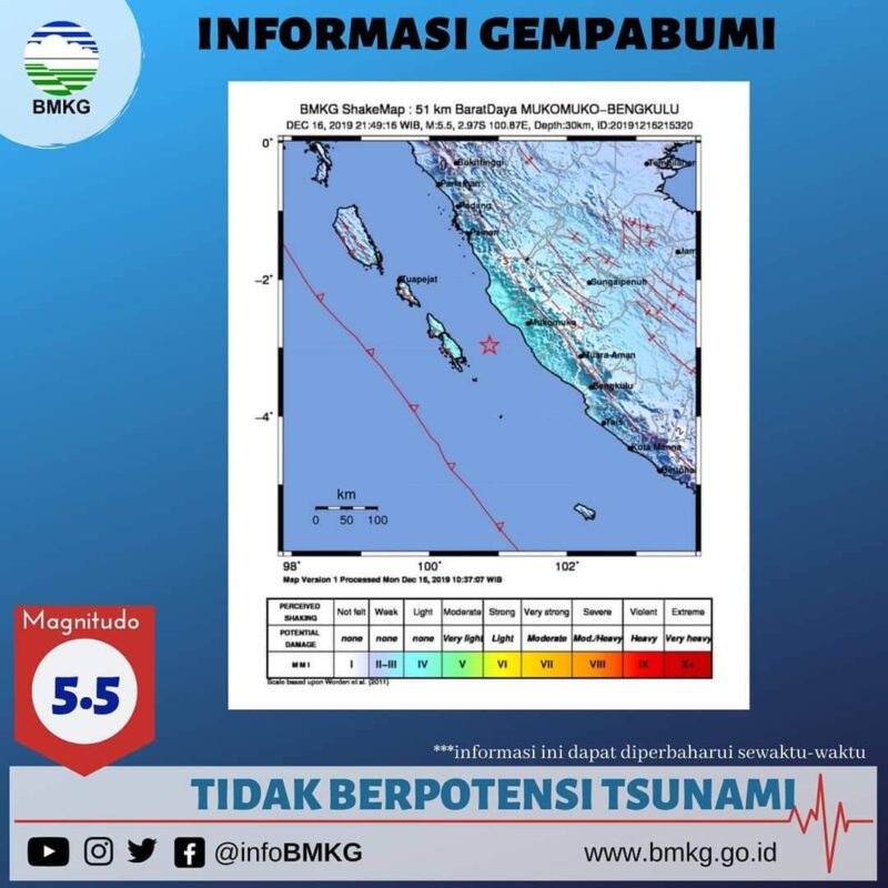 Gempa bumi berkekuatan magnitudo 5,5 mengguncang Kabupaten Mukomuko, Bengkulu. Gempa tidak berpotensi menimbulkan gelombang tsunami.