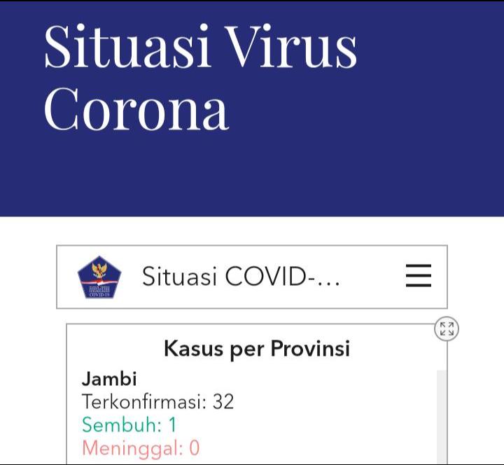 Menurut data situs covid19.go.id update 26 April 2020 pukul 16.00, dengan bertambahnya 11 pasien positif corona, jumlah pasien terkonfirmasi positif Provinsi Jambi 32 orang dan sembuh 1 orang.