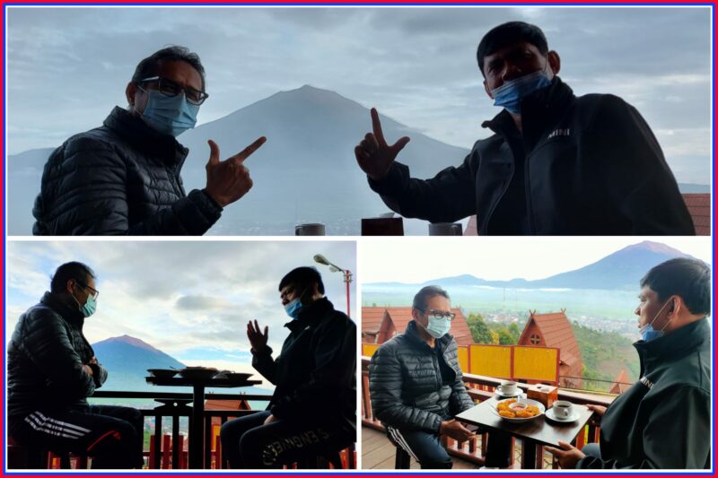 Syafril dan Irwan Prayitno tampak berbincang santai sambil menyeruput Kopi Kerinci. Keduanya terlihat menikmati indahnya pemandangan kokohnya Gunung Kerinci dan hamparan perkebunan Teh yang hijau.