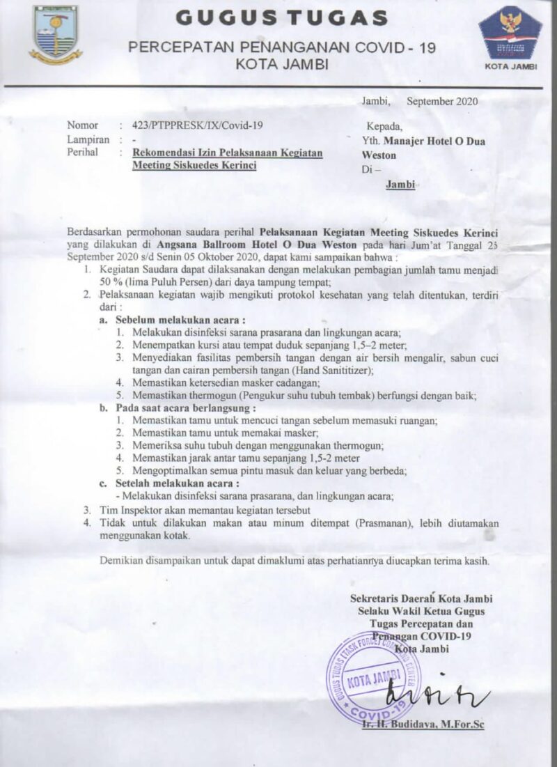 “Hal tersebut terbukti dengan surat dari gugus tugas covid19 Kota Jambi yang ditujukan kepada pihak hotel, dimana izin diberikan dari tanggal 23 September sampai 04 Oktober, dengan ketentuan yang telah ditaati oleh pihak hotel,” bebernya.