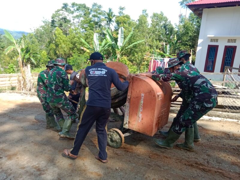 KERINCI, GJ – Anggota Satgas TMMD Reguler 109 Kodim 0417/Kerinci dan warga di Desa Sungai Langkap kompak memindahkan mesin molen untuk pengecoran lapangan . Besi tua pengaduk semen itu menjadi andalan dalam pekerjaan.