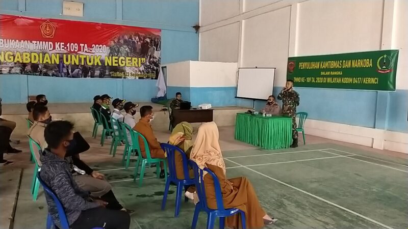 KERINCI, GJ -Berbagai penyuluhan dan sosialisasi merupakan rangkaian kegiatan non fisik dari program terpadu TMMD ke-109 Kodim 0417/Kerinci yang sudah terprogram dan terjadwalkan, khususnya untuk hari ini pelaksanaan penyuluhan tentang Kamtibmas dan Narkoba di Gedung Serbaguna Desa Sungai Langkap Kecamatan Sulak Mukai Kabupaten Kerinci, Senen ( 05/10/2020).