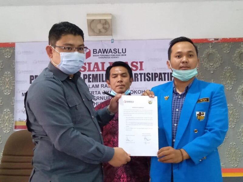 KERINCI – Badan Pengawas Pemilihan Umum (BAWASLU) Kabupaten Kerinci gelar MOU dengan DPD II KNPI Kabupaten Kerinci, pada 06/10/2020.