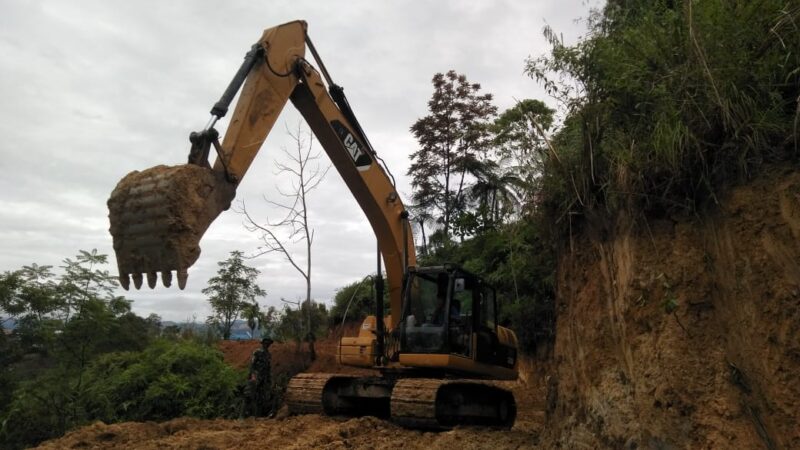 KERINCI, GJ – TNI Manunggal Membangun Desa (TMMD) ke-109 TA. 2020 di wilayah Kodim 0417/Kerinci, terlihat alat berat excavator yang sedang bekerja dan didampingi oleh Anggota Satgas TMMD, Sertu Hermanadi untuk membuka akses jalan antar desa dikecamatan Sulak Mukai Kabupaten Kerinci Minggu (11/10/2020).