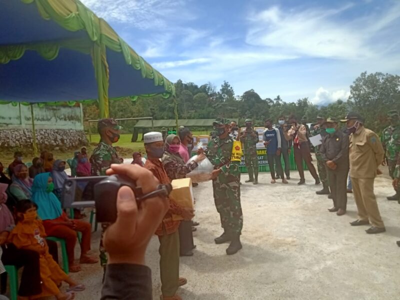 KERINCI – Dalam rangka Tentara Menunggal Membangun Desa (TMMD) ke -109, Kodim 0417/Kerinci bagi-bagi sembako kepada warga desa sasaran TMMD di Desa Sungai Langkap, Kecamatan Siulak Mukai, Kabupaten Kerinci Selasa (13/10/2020).