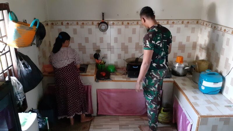 Seperti yang di lakukan Pratu Defriyadi dan beberapa orang anggota satgas lainnya ia membantu orang tua asuh menyapu, memasak dan mencuci piring sebelum berangkat menuju tempat bekerja ke lokasi pekerjaan fisik kegiatan TMMD.