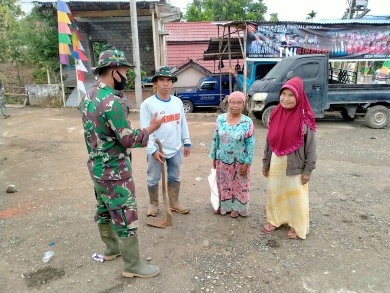 SUNGAIPENUH – Personil Satgas TMMD Reguler ke- 109 Kodim 0417/Kerinci Prada Yogi saat mau berangkat ke Lokasi kerja sosialisasi menghampiri warga masyarakat yang beramai jalan kaki di Desa Sungai Langkap, Kecamatan Siulak Mukai Kabupaten Kerinci.