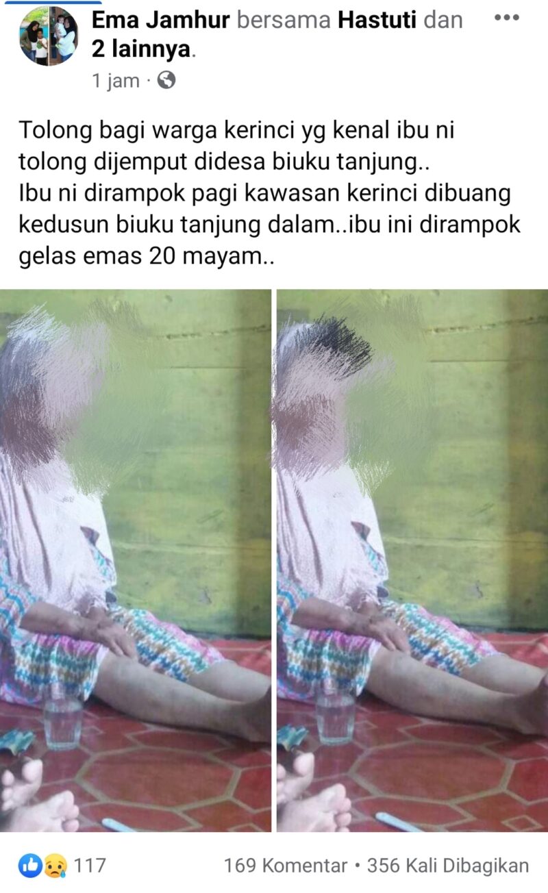 Kejadian tersebut menjadi viral saat ini di Media Sosial, setelah akun Facebook atas nama Ema Jamhur membagikan dengan meng-upload fhoto korban dengan kondisi duduk dan raut wajah trauma dengan tulisan “Tolong bagi warga Kerinci yang kenal ibu ini tolong dijemput di Desa Biuku Tanjung..Ibu ini dirampok pagi kawasan Kerinci dibuang kedusun Biuku Tanjung dalam..ibu ini dirampok gelas emas 20 mayam,” tulis Ema dalam akun Facebook miliknya.