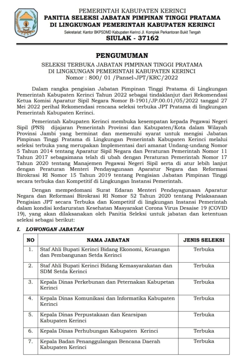 Kepala Badan Kepegawaian dan Pengembangan Sumber Daya Manusia Daerah (BKPSDMD) Kerinci, Efrawadi, dikonfirmasi membenarkan bahwa saat ini telah dibuka seleksi Jabatan pimpinan Tinggi Pratama dilingkup Pemerintah Kabupaten Kerinci sesuai dengan Nomor : 800/ 01 /Pansel-JPT/KRC/2022 Dalam rangka pengisian Jabatan Pimpinan Tinggi Pratama di Lingkungan Pemerintah Kabupaten Kerinci Tahun 2022 sebagai tindaklanjut dari Rekomendasi Ketua Komisi Aparatur Sipil Negara Nomor B-1901/JP.00.01/05/2022 tanggal 27Mei 2022 perihal Rekomendasi rencana seleksi terbuka JPT Pratama di lingkungan Pemerintah Kabupaten Kerinci.