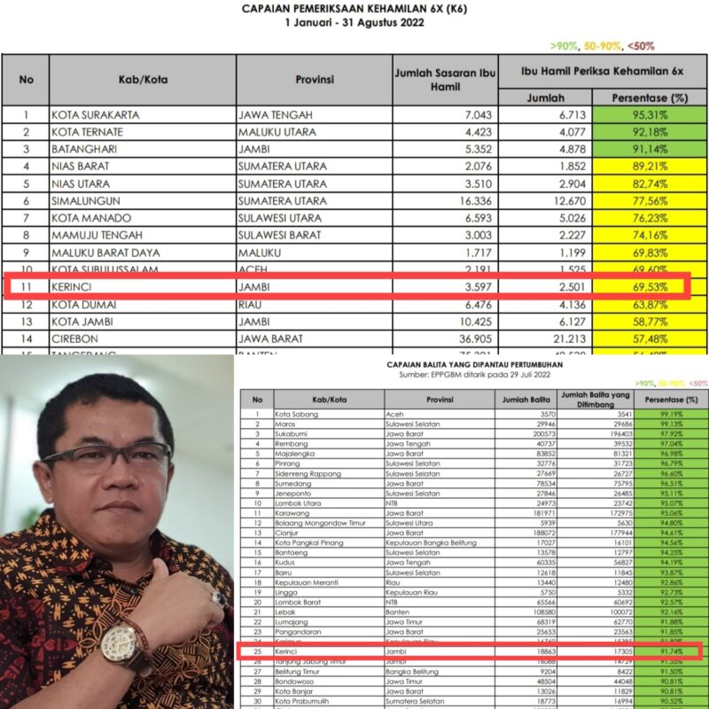 Informasi yang berhasil dihimpun, dimana Pemerintah Kabupaten Kerinci melalui sektor Dinas Kesehatan berhasil meraih 2 penilaian terbaik yakni berada pada nomor urut 11 Capaian Pemeriksaan Kehamilan 6X (K6) dan meraih urutan ke 25 Capaian Balita yang Dipantau Pertumbuhan dari 514 Kabupaten / Kota seluruh Indonesia.