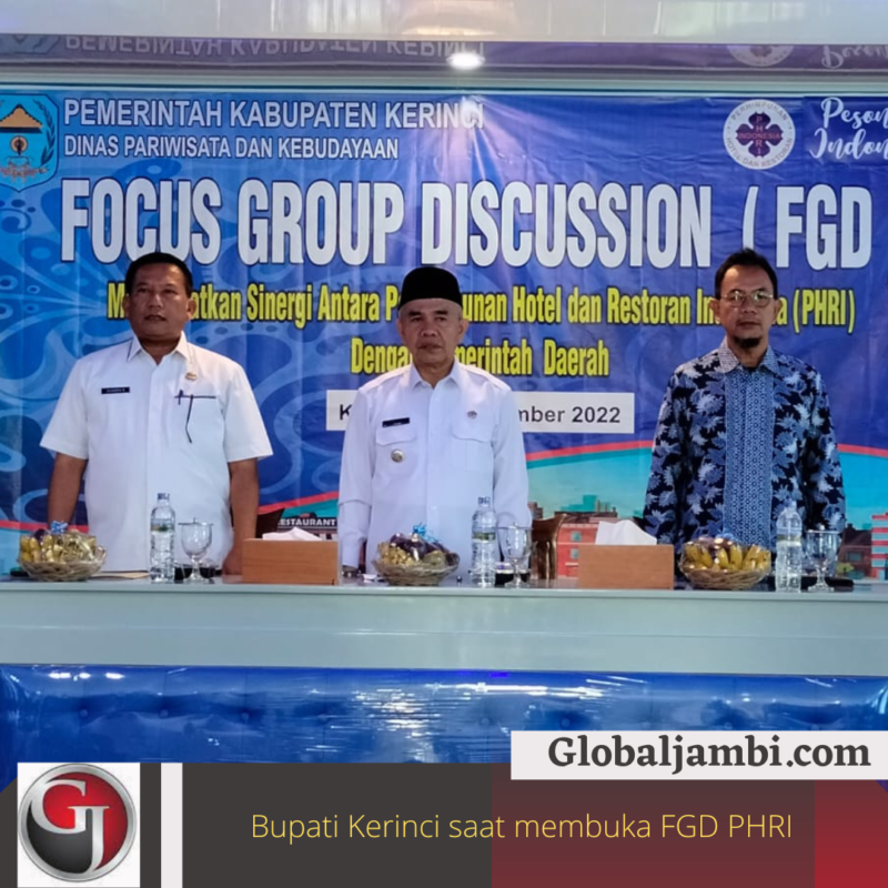 KERINCI, GlobalJambi – Dalam usaha pengembangan pariwisata dan pembangunan daerah, Pemerintah Kabupaten (Pemkab) Kerinci melalui Dinas Pariwisata dan Kebudayaan di Kabupaten Kerinci, pada Rabu (7/12) menggelar Focus Group Discussion (FGD).