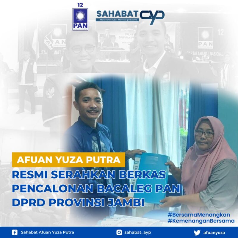 GLOBALJAMBI.COM – Siap maju Bakal calon legislatif (Bacaleg) Dewan Perwakilan Rakyat Daerah (DPRD) Provinsi Jambi, Afuan Yuza Putra, secara resmi menyerahkan berkas bacaleg ke Partai Amanat Nasional (PAN) Provinsi Jambi.
