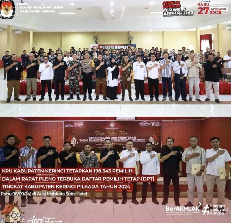Dalam Rapat Pleno Terbuka tersebut, KPU Kabupaten Kerinci menetapkan Rekapitulasi Daftar Pemilih Tetap (DPT) dengan jumlah 198,343 pemilih dengan rincian 98,237 pemilih laki-laki, 100,106 pemilih perempuan yang tersebar di 18 kecamatan 287 Kelurahan dan desa, serta 483 TPS di Kabupaten Kerinci.