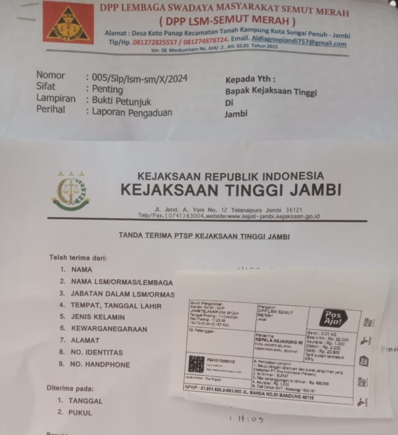 ” Kami atas nama lembaga swadaya masyarakat Semut Merah Resmi melaporkan dugaan kasus suap kasi pidsus beserta rekan ke Kejati Jambi yang ditembuskan langsung ke kejaksaan Agung RI dan Kejaksaan Negeri Sungai penuh, dalam surat tersebut kami meminta kepada kepala kejaksaan tinggi Jambi memanggil dan memeriksa terkait temuan kami dilapangan”, ungkap Aldi saat dikonfirmasi ke media ini Jum’at 11/10/24.