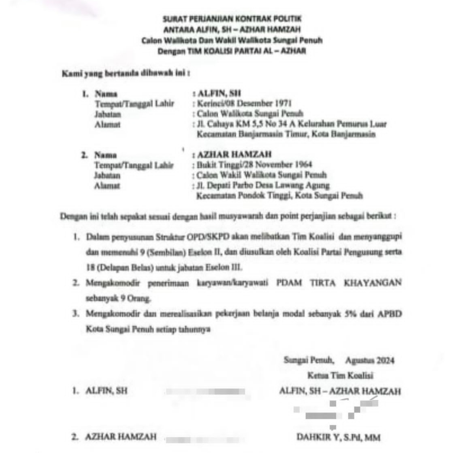 GLOBALJAMBI.COM, SUNGAIPENUH- Diduga, Kontrak politik antara Alfin dan Azhar Hamzah (AL-AZHAR) calon walikota dan wakil walikota Sungaipenuh 2024-2029 dengan Koalisi Partai Pengusung, beredar.