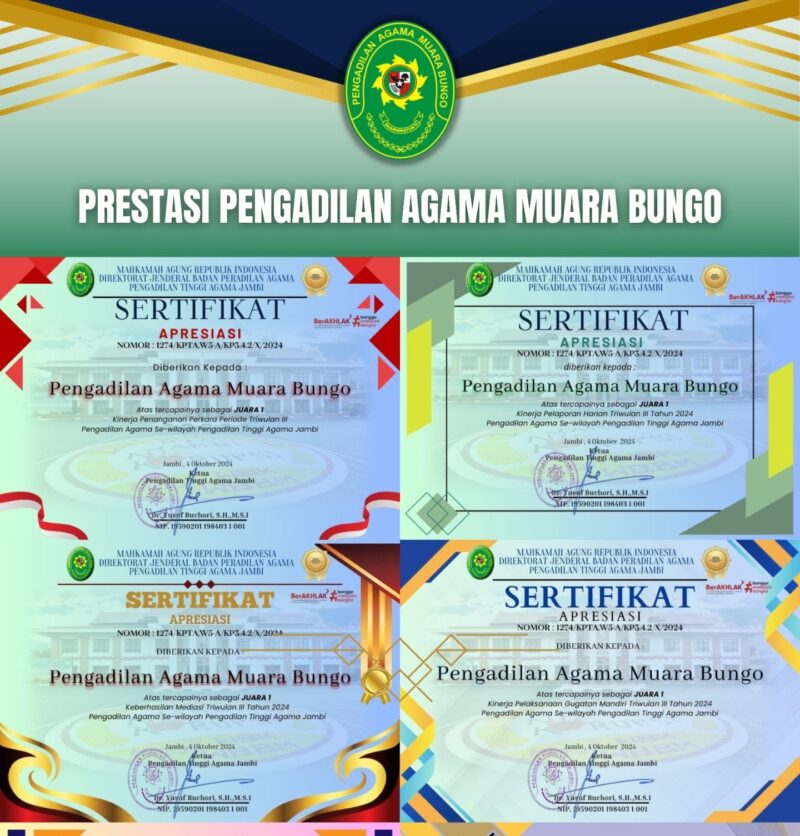 Hasil penilaian kinerja satuan kerja di wilayah PTA Jambi ini diketahui Berdasarkan Surat Keputusan Ketua Pengadilan Tinggi Agama Jambi. Nomor: 1274/KPTA.W5-A/SK.KP3.4.2/X/2024 tentang penetapan pemenang dan pemberian penghargaan kinerja berprestasi bagi pengadilan agama sewilayah PTA Jambi per triwulan III tahun 2024, tanggal 04 Oktober 2024. (Jurdilaga PA Muara Bungo)