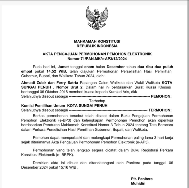 Pemohon : Ahmadi Zubir dan Ferry Satria Calon Walikota dan Calon Wakil Walikota KOTA SUNGAI PENUH No Urut 2, dengan Kuasa Hukum : Kurniad Aris, dkk. Dengan Pokok Permohonan : Perselisihan Hasil Pemilihan Umum Walikota KOTA SUNGAI PENUH Tahun 2024.