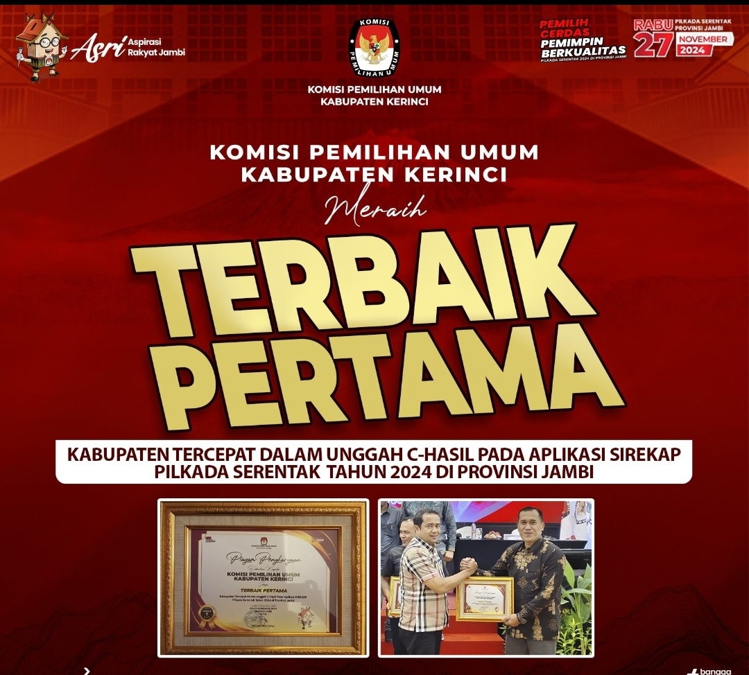 Penghargaan ini diberikan oleh KPU Provinsi Jambi sebagai bentuk apresiasi atas kinerja KPU Kabupaten Kerinci dalam memastikan transparansi dan akurasi hasil Pilkada. KPU Provinsi Jambi, dalam acara penyerahan penghargaan, mengapresiasi dedikasi dan profesionalisme jajaran KPU Kerinci yang mampu menyelesaikan proses unggah data dengan cepat tanpa mengesampingkan keakuratan.