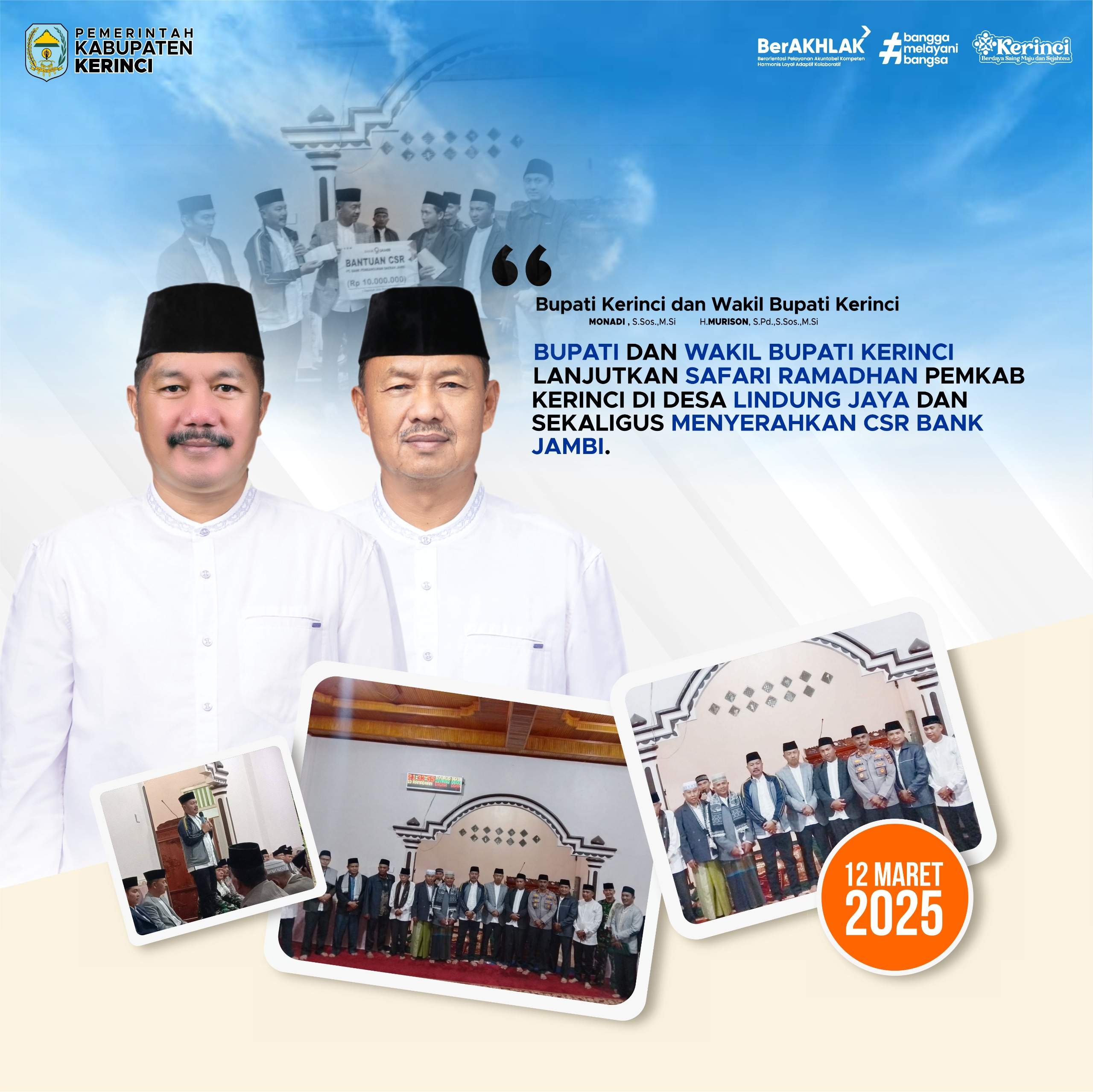 Mengawali sambutan dari Kepala Desa Lindung Jaya menyampaikan rasa terima kasih atas kunjungan perdana Bupati Monadi ke desa mereka. “Kami mengucapkan terima kasih atas kunjungan Bupati Monadi dan Wakil Bupati Murison beserta rombongan dalam Safari Ramadan ini. Kehadiran beliau menjadi kebanggaan bagi masyarakat kami,” ujarnya. Ia juga menyampaikan ucapan selamat atas pelantikan Monadi dan Murison sebagai Bupati dan Wakil Bupati Kerinci periode 2025-2030 oleh Presiden Prabowo Subianto di Jakarta.