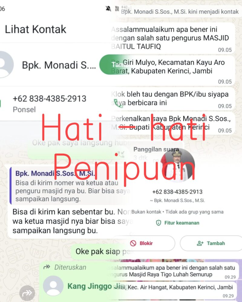 GLOBALJAMBI.COM, KERINCI – Masyarakat Kabupaten Kerinci diminta waspada terhadap modus penipuan yang mengatasnamakan Bupati Kerinci, Monadi. Baru-baru ini beredar pesan melalui aplikasi WhatsApp dari nomor tidak dikenal yang mengklaim sebagai Bupati Monadi dan menawarkan bantuan untuk pembangunan masjid.