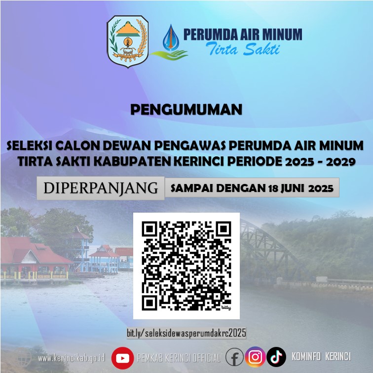KERINCI – Panitia Seleksi Calon Dewan Pengawas Perusahaan Umum Daerah (Perumda) Air Minum Tirta Sakti Kabupaten Kerinci mengumumkan perpanjangan waktu pendaftaran calon anggota Dewan Pengawas Tahun 2025.
