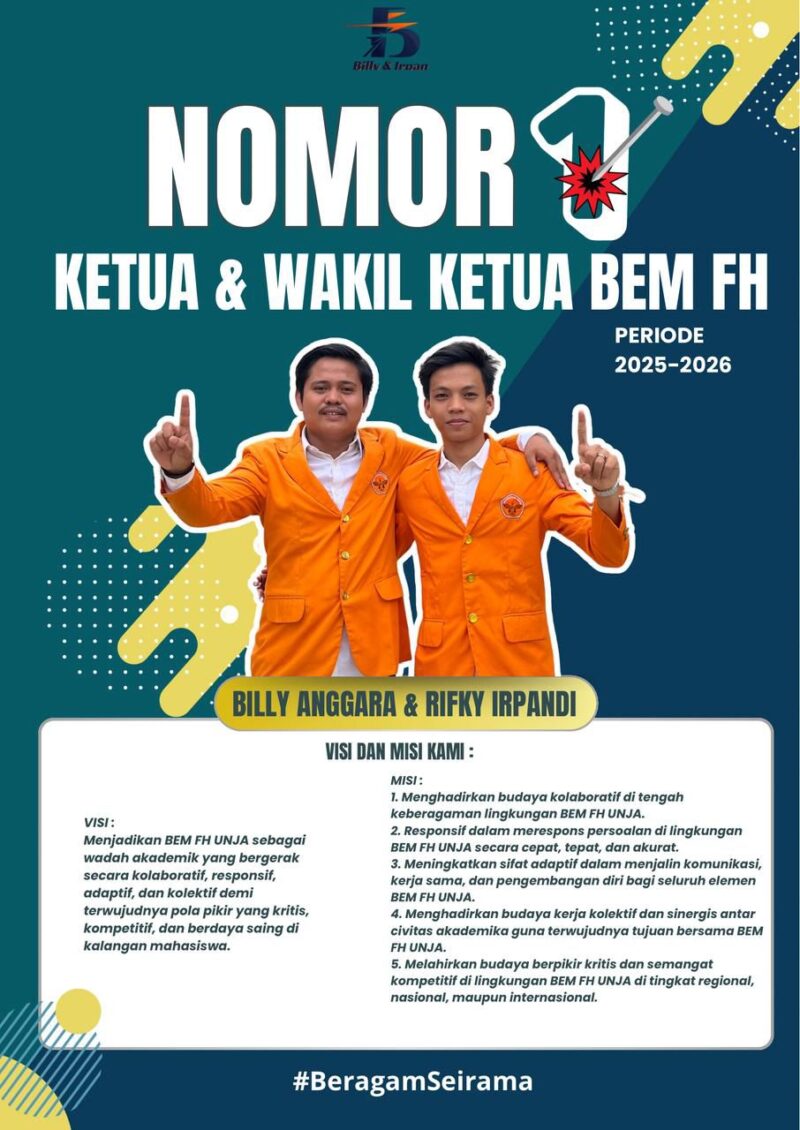 GLOBALJAMBI.CO.ID, JAMBI – Debat Pasangan calon Ketua dan Wakil Ketua BEM Fakultas Hukum Universitas Jambi (FH UNJA) 21 Juni 2025, Bily Anggara Jufri dan Rifky Irpandi, mengumumkan Keseriusan nya. Dengan semangat membangun ruang perjuangan mahasiswa yang inklusif, kritis, dan berdampak nyata, Bily–Irfan hadir membawa visi segar untuk kemajuan kolektif KBM FH UNJA.