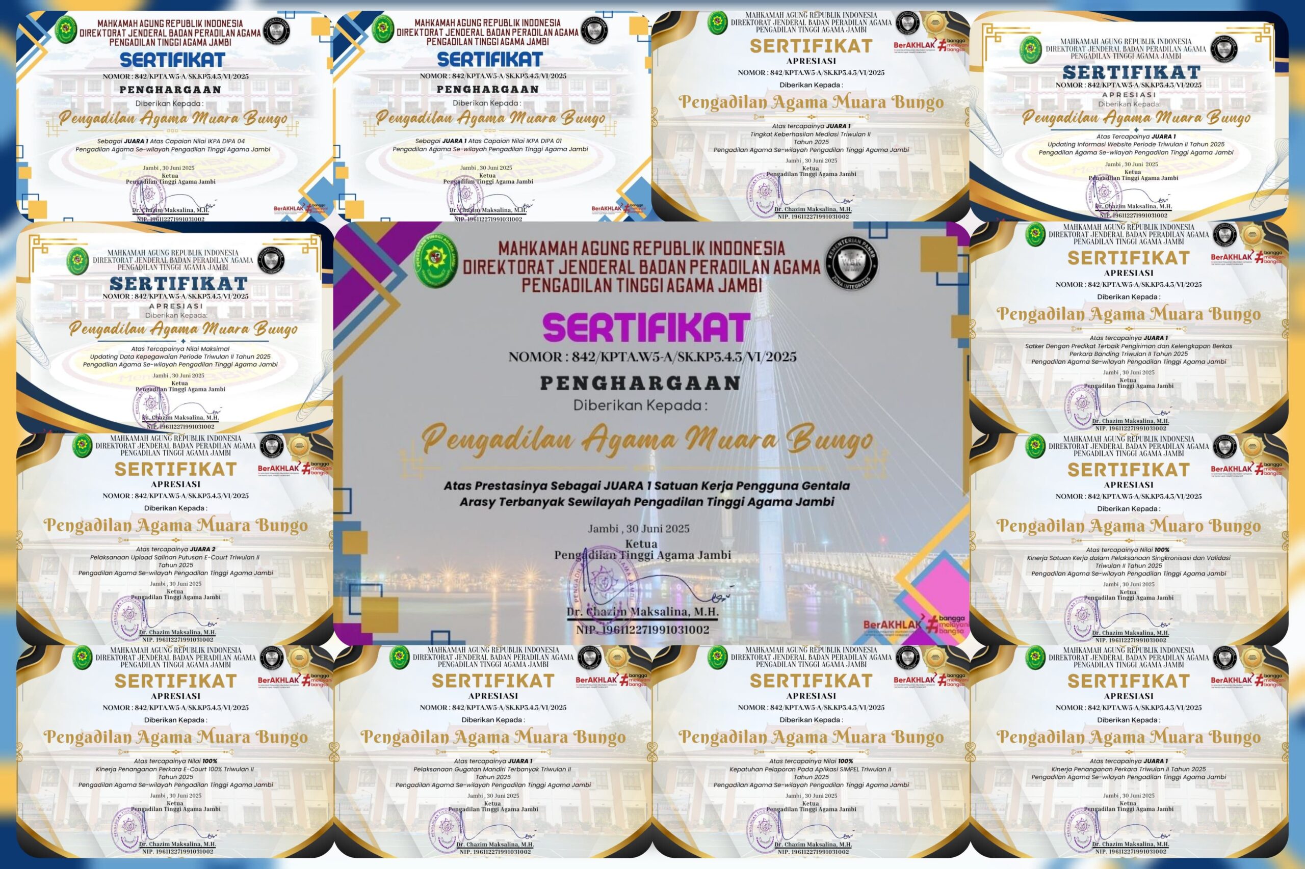Setelah di triwulan I tahun 2025 menjadi peraih penghargaan terbanyak pada penilaian kinerja yang diberikan oleh PTA Jambi. Menyusul kemudian sebagai satuan kerja peringkat 3 nasional Pengadilan Agama Kelas II penilaian oleh Badan Peradilan Agama Mahkamah Agung RI, Kini prestasi di triwulan II kembali PA Muara Bungo menjadi yang terbaik dengan torehan peraih piagam penghargaan terbanyak.