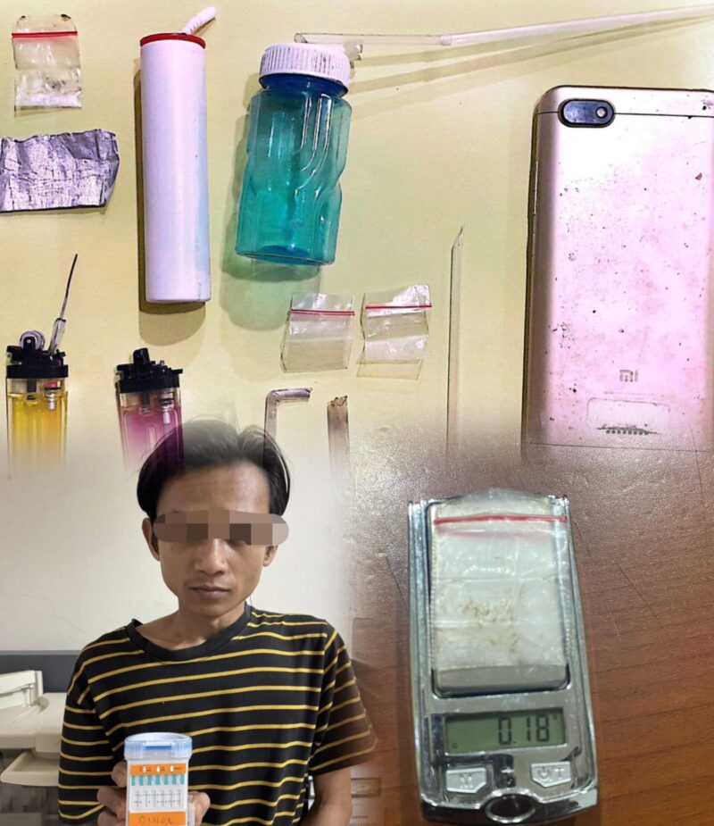 Barang bukti yang diamankan antara lain: 1 paket shabu seberat ± 0,18 gram, 1 alat hisap (bong), 2 korek api gas, 3 plastik klip bening, 1 botol plastik, 1 kaca pirek, 2 sedotan plastik, 1 unit handphone Redmi 6A warna gold.