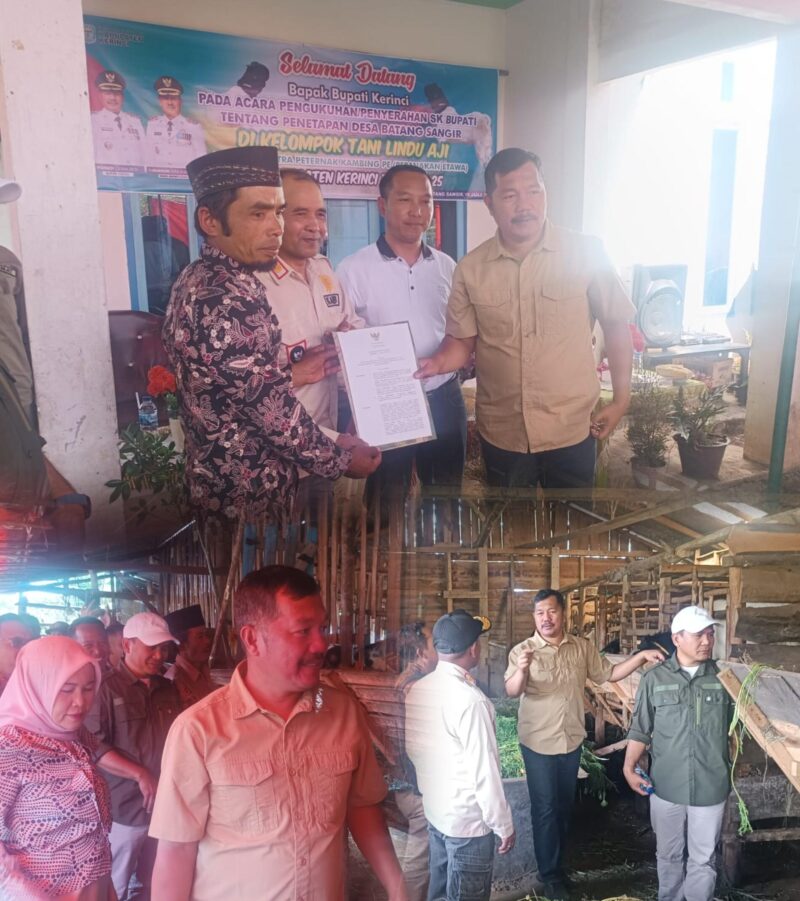 GLOBALJAMBI.CO.ID, Kerinci – Pemerintah Kabupaten Kerinci secara resmi menetapkan Desa Batang Sangir sebagai Sentra Peranakan Kambing Etawa. Penetapan ini dituangkan dalam Surat Keputusan (SK) Bupati yang diserahkan langsung oleh Bupati Kerinci, Monadi, S.Sos., M.Si., kepada Kepala Desa Batang Sangir dalam sebuah acara resmi yang digelar di desa tersebut.