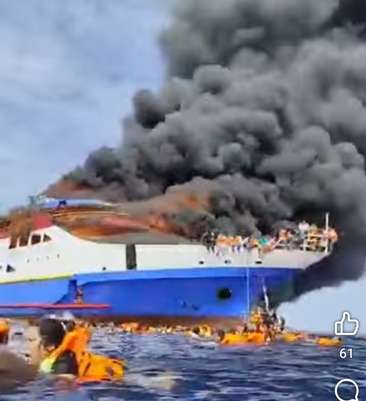 Kebakaran hebat itu sontak memicu kepanikan ratusan penumpang. Asap pekat membumbung dari dek atas kapal, mengepung seluruh bagian kapal, membuat para penumpang berhamburan menyelamatkan diri, termasuk anak-anak dan lansia. Beberapa melompat ke laut, berharap bantuan segera datang.