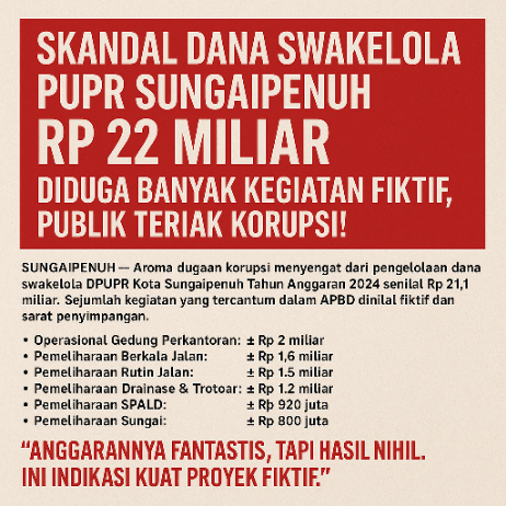 GLOBALJAMBI.CO.ID, JAMBI – Dugaan penyelewengan anggaran kembali mencuat di lingkup Pemerintah Kota Sungaipenuh. Kali ini, sorotan tertuju pada Dinas Pekerjaan Umum dan Penataan Ruang (PUPR) Kota Sungaipenuh, terkait pengelolaan dana swakelola senilai Rp22 miliar pada tahun anggaran 2024 yang diduga fiktif.