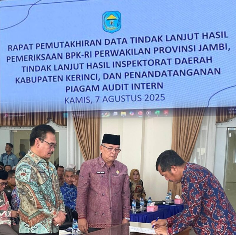 Rakor ini membahas progres TLHP dari BPK RI Perwakilan Provinsi Jambi dan hasil pengawasan internal APIP Kabupaten Kerinci. Tak hanya itu, momen penting ini juga dirangkai dengan penandatanganan Piagam Audit Intern, sebagai bentuk komitmen penguatan fungsi pengawasan internal di lingkungan Pemkab Kerinci.