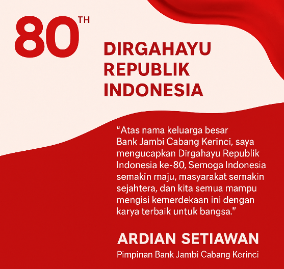 Sungaipenuh – Dalam momentum Hari Ulang Tahun (HUT) Kemerdekaan Republik Indonesia ke-80 tahun 2025, Pimpinan Bank Jambi Cabang Kerinci, Ardian Setiawan, menyampaikan ucapan selamat sekaligus ajakan untuk terus menjaga semangat kebersamaan dan membangun negeri.