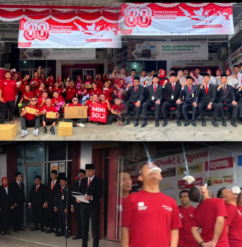 GLOBALJAMBI. CO. ID, Kerinci – Dalam rangka memeriahkan Hari Ulang Tahun (HUT) Republik Indonesia ke-80, Bank Jambi Cabang Kerinci menggelar apel dihalaman kantor Bank Jambi Cabang Kerinci di Siulak bersama seluruh karyawan pada Minggu (17/08/2025).