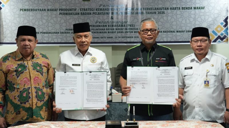 “PKS tentang penerimaan wakaf uang ini, untuk mendukung gerakan nasional wakaf uang antara perwakilan Badan Wakaf Indonesia Provinsi Jambi dan Bank Jambi,” kata Dirut Bank Jambi, H. Khairul Suhairi, S.E.,M.M.,CRM, Rabu (24/9).