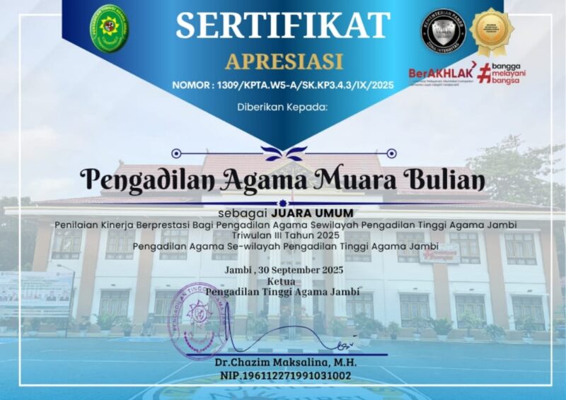 MUARA BULIAN – Pengadilan Agama Muara Bulian kelas I B ditetapkan sebagai juara umum pada penilaian kinerja satuan kerja se wilayah PTA Jambi. Hal itu diketahui dari sertifikat apresiasi yang ditandatangani oleh Ketua Pengadilan Tinggi Agama Jambi Dr. Chazim Maksalina, M.H nomor 1309/KPTA.W5-A/SK.KP3.4.3/IX/2025 tanggal 30 September 2025.