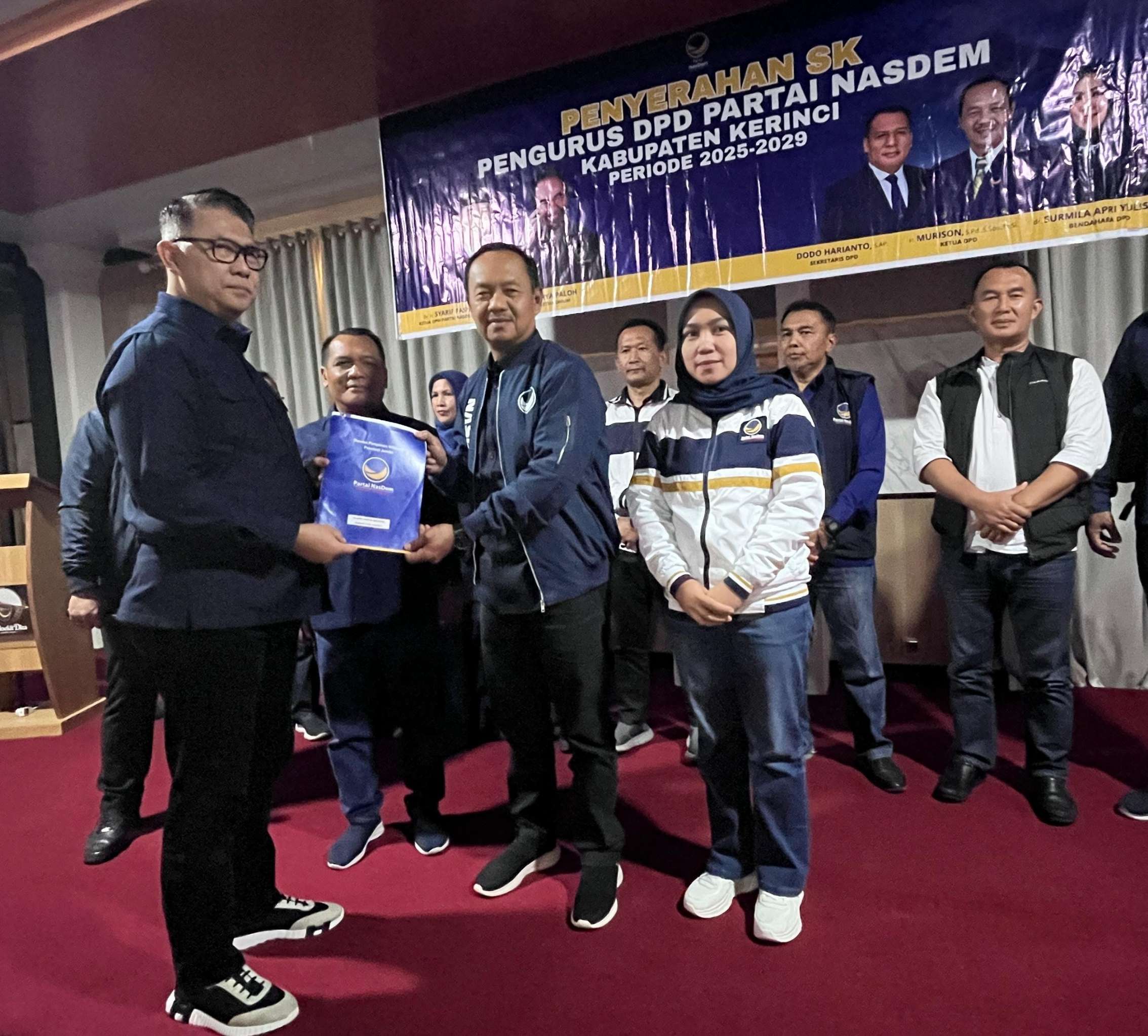GLOBALJAMBI.CO.ID, KERINCI – Wakil Bupati Kerinci, Murison, resmi menerima Surat Keputusan (SK) sebagai Ketua Dewan Pimpinan Daerah (DPD) Partai NasDem Kabupaten Kerinci periode 2025–2029. SK tersebut diserahkan langsung oleh Ketua DPW Partai NasDem Provinsi Jambi, Sy Fasha, yang juga merupakan anggota DPR RI.