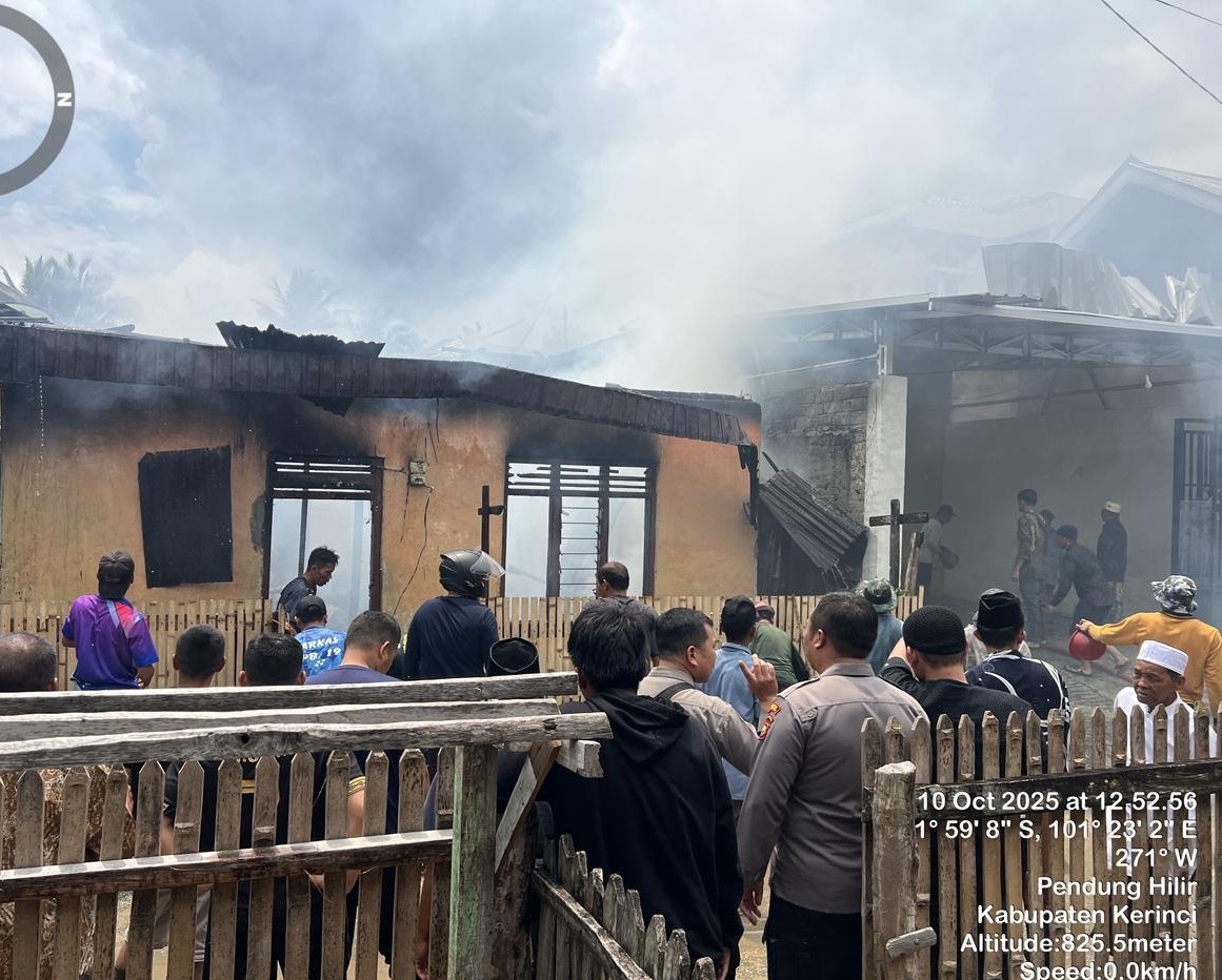 GLOBALJAMBI.CO.ID, KERINCI — Peristiwa kebakaran kembali terjadi di Kabupaten Kerinci. Kali ini, musibah kebakaran melanda tiga unit rumah warga di Desa Pendung Hilir, Kecamatan Air Hangat, pada Jumat (10/10/2024) sekira pukul 12.20 WIB, tepat menjelang waktu Salat Jumat.