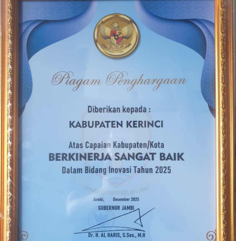 GLOBALJAMBI.CO.ID, JAMBI – Pemerintah Kabupaten Kerinci kembali menorehkan prestasi gemilang di tingkat Provinsi Jambi. Pada tahun 2025, Kabupaten Kerinci berhasil meraih Predikat Kabupaten dengan Kinerja Sangat Baik di Bidang Inovasi Daerah, dalam ajang Penganugerahan Capaian Kinerja Bidang Inovasi dan Pengelolaan Keuangan Daerah Tahun 2025.