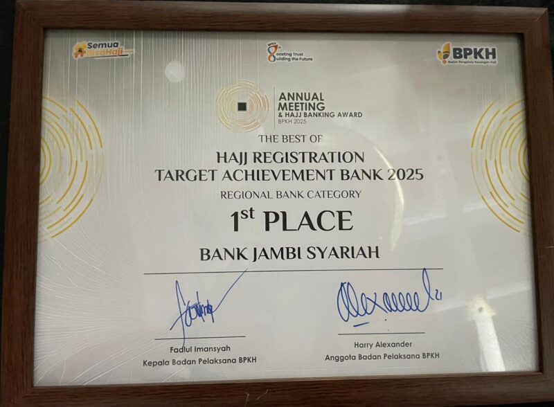 Penghargaan dan reward umrah tersebut menjadi pengakuan atas peran Bank Jambi dalam menjaga kepercayaan jamaah calon haji melalui layanan perbankan yang andal dan berorientasi pada kemaslahatan umat.