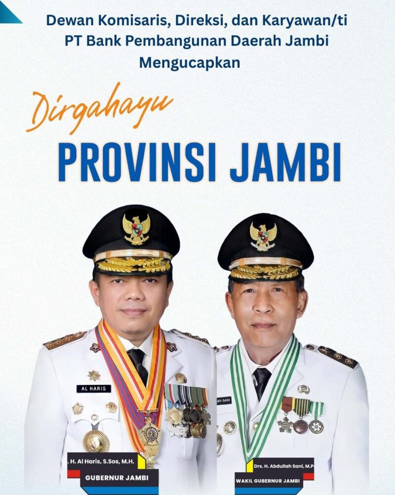 GLOBALJAMBI.CO.ID– Komisaris, Direksi, dan segenap karyawan Bank Jambi melalui Direktur Utama Bank Jambi, H. Khairul Suhairi, S.E., M.M., CRM, menyampaikan ucapan selamat Hari Ulang Tahun (HUT) ke-69 Provinsi Jambi yang diperingati pada tahun 2026.
