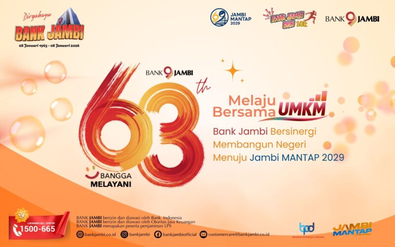 GLOBALJAMBI.CO.ID – Peringatan Hari Ulang Tahun (HUT) ke-69 Provinsi Jambi tahun 2026 menjadi momentum strategis untuk menegaskan arah dan kualitas pembangunan daerah yang berkelanjutan. Momentum tersebut kian bermakna karena bertepatan dengan peringatan HUT ke-63 Bank Jambi pada 8 Januari 2026, menandai lebih dari enam dekade peran Bank Jambi sebagai bank milik pemerintah daerah yang konsisten mendukung penguatan ekonomi regional.